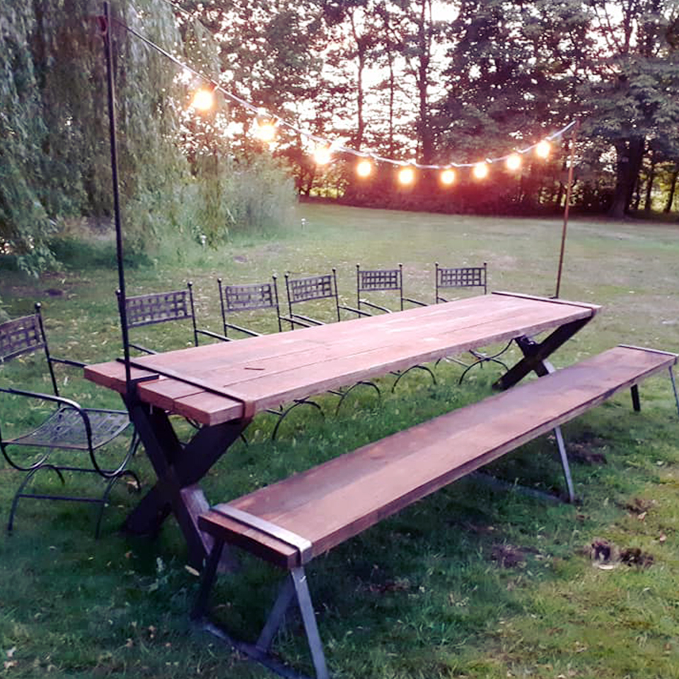 Kasteeltafel met bijhorende bank in tropisch hardhout. Smeedijzeren beugels met X poten 3.8m tafel met 4,5m bank.