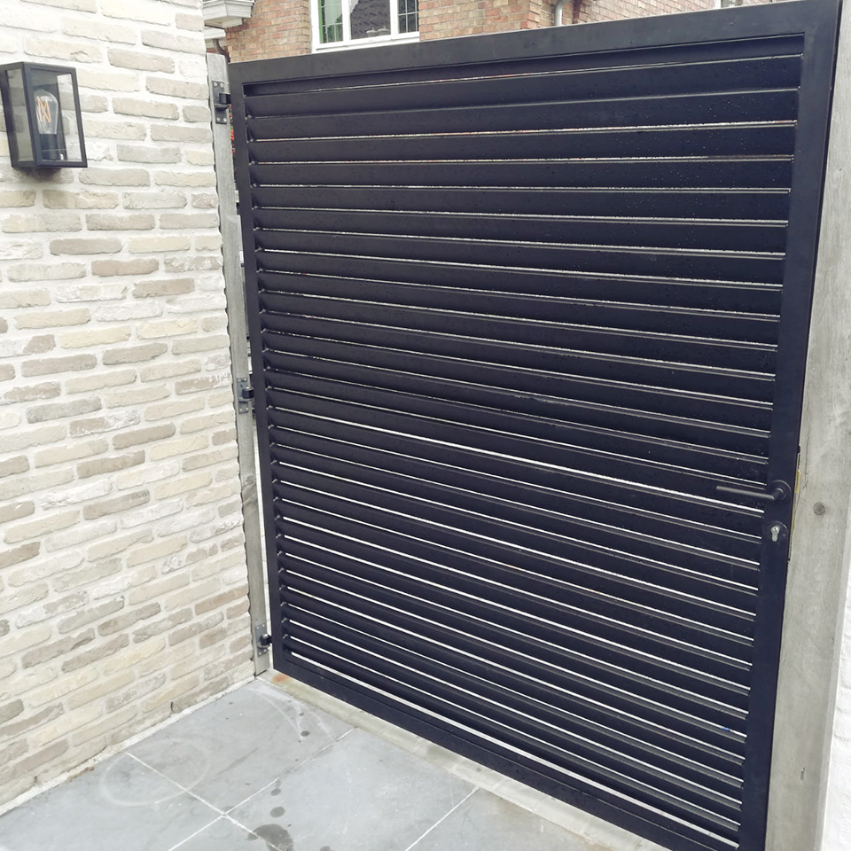 Toegangspoort, lamellenstructuur. Perfect winddoorlatend.